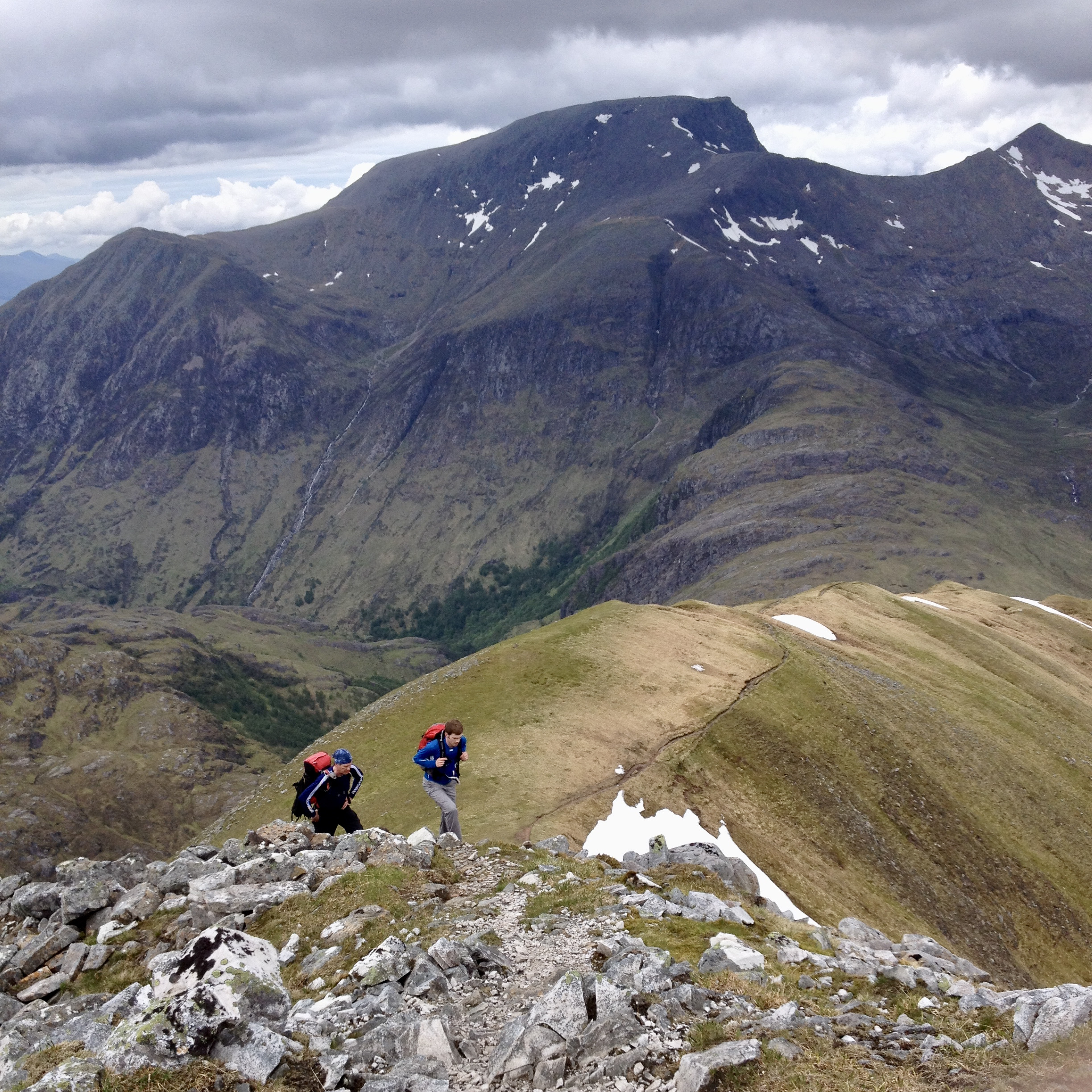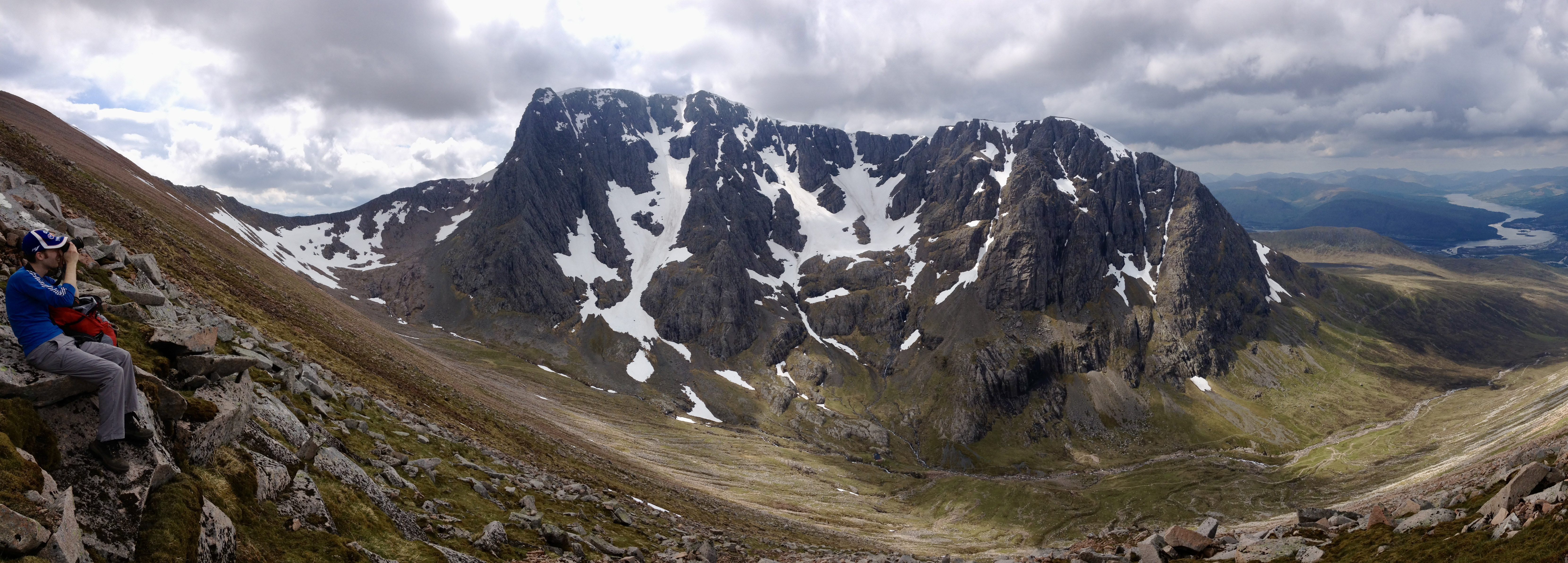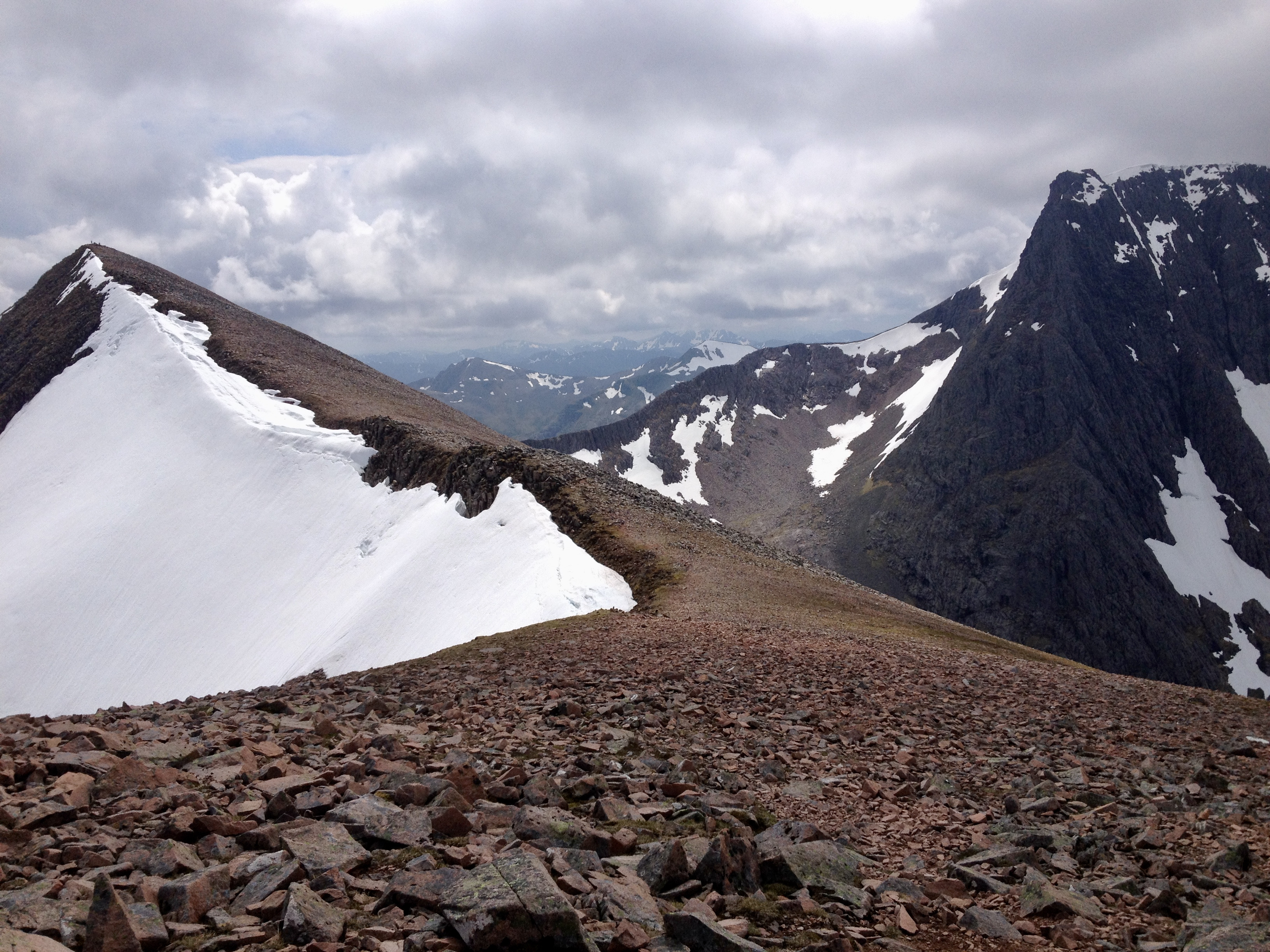 The connoisseur’s route from Glen Nevis campsite turns left at the ‘Halfway Lochan’ and contours round beneath the north face of Ben Nevis. It looks an entirely different mountain from this angle, and the walker’s route involving staggering up the steep ground onto Càrn Mòr Dearg, from where the view is really quite good (if it’s clear, as it was for us). From here, the CMD arête is surely the finest way to approach the highest ground in the UK. Not content with that, we started the Ring of Steall the next day but had to turn back just before the half way point due to walking boot (and knee) failure. But we did have a close encounter with a ptarmigan.